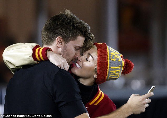 Miley and Patrick, who is also 21, provided entertaining distraction while making out in full view of spectators crowding the Los Angeles Memorial Coliseum.